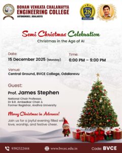 Bonam Venkata Chalamayya Engineering College (Autonomous), Odalarevu, cordially invites faculty, students, and staff to the Semi Christmas Celebration – Christmas in the Age of AI, celebrating joy, unity, and festive spirit.