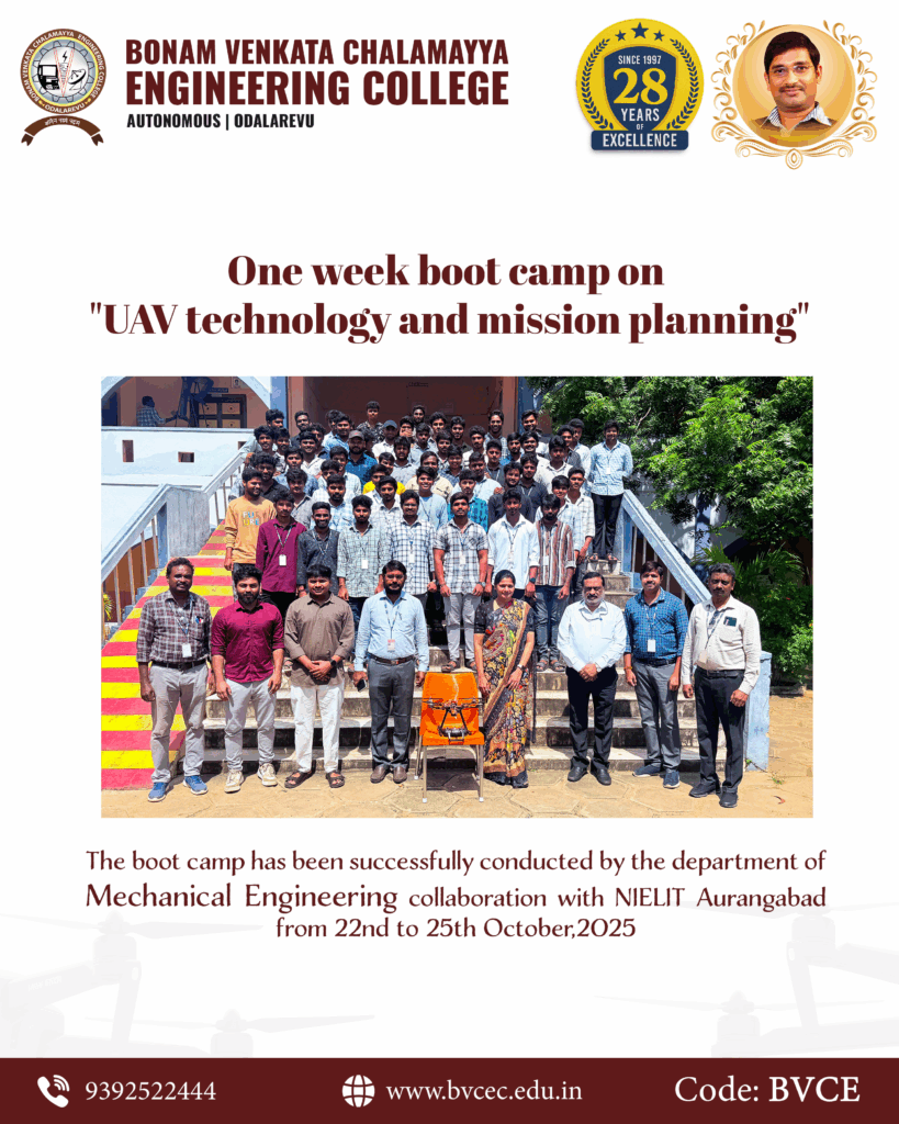 The Department of Mechanical Engineering, BVCE Odalarevu, has successfully organized a one-week workshop for 4th-year Mechanical Engineering students on “UAV Technology and Mission Planning” in collaboration with NIELIT.