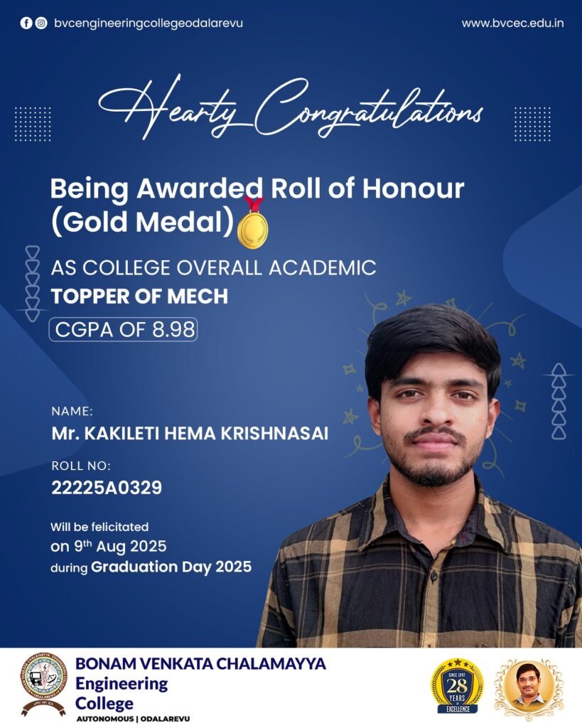 A golden moment for a golden mind!Congratulations to Mr. Kakileti Hema Krishnasai for being awarded the Roll of Honour (Gold Medal) 🏅 as the overall academic topper of MECH with an impressive CGPA of 8.98!