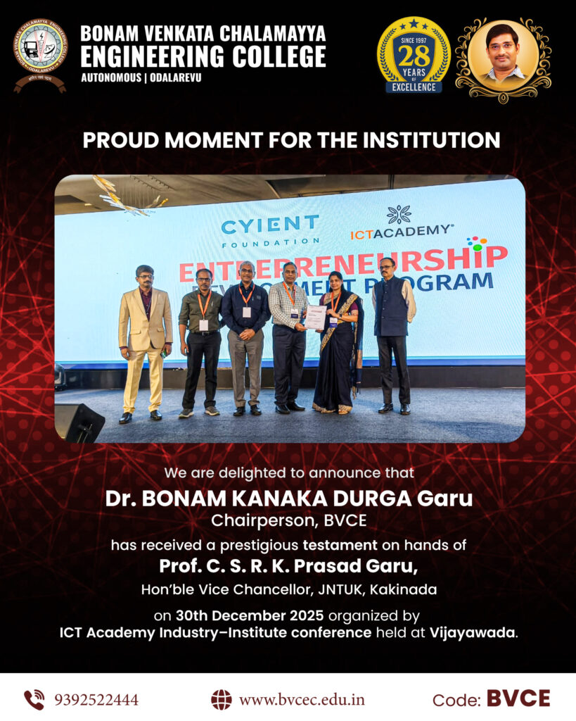 BVCE Celebrates a Proud Moment as Chairperson Dr. Bonam Kanaka Durga Garu Is Honored at the ICT Academy Industry–Institute Interaction Conference, Vijayawada