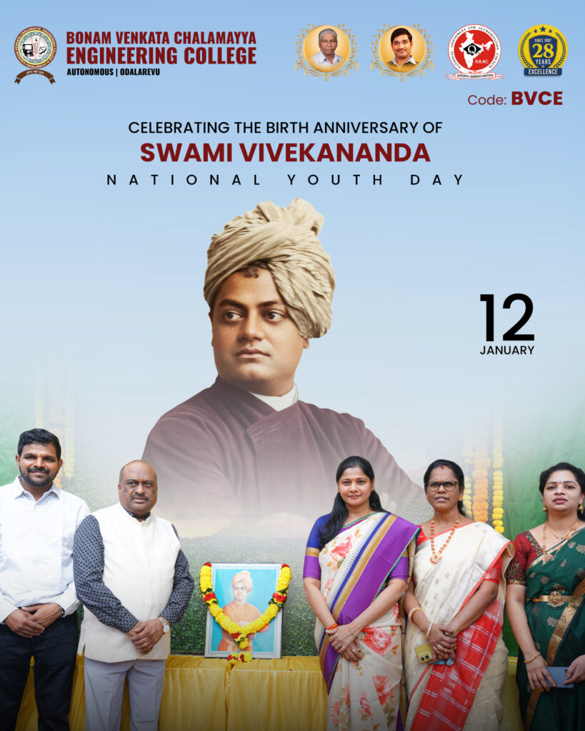Bonam Venkata Chalamayya Engineering College (BVCE) proudly celebrates National Youth Day on the auspicious occasion of the Birth Anniversary of Swami Vivekananda, the great visionary, philosopher, and youth icon of India.