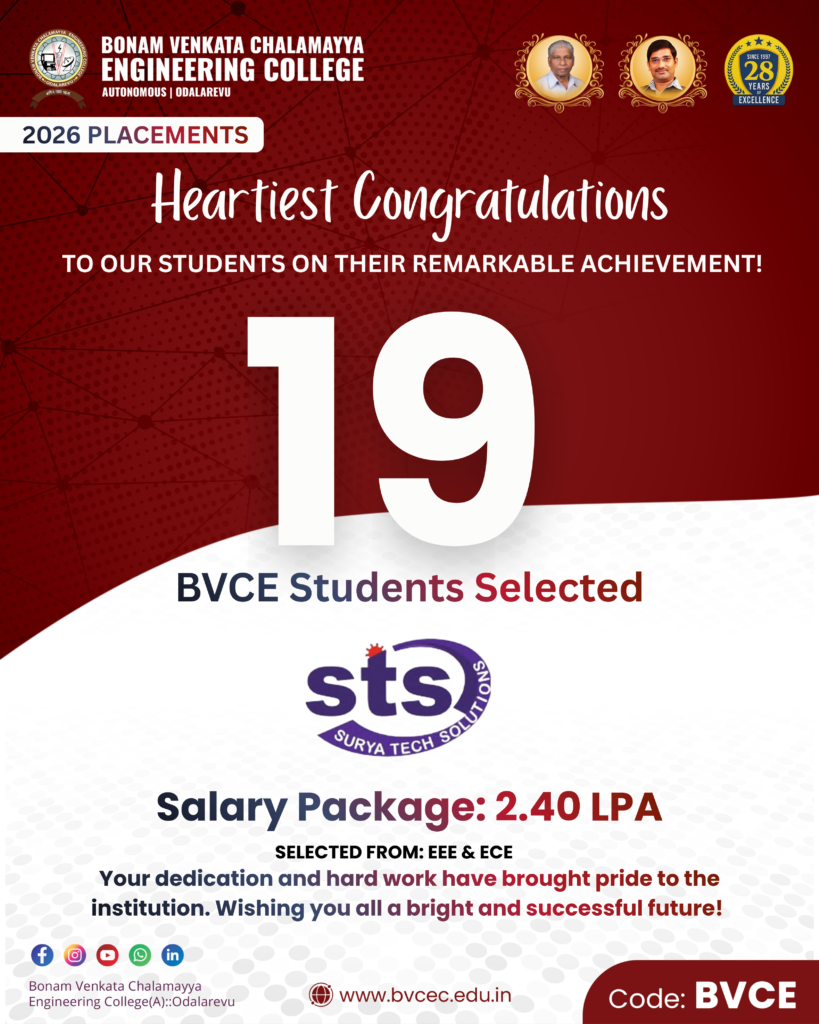 BVCE proudly congratulates 19 students from EEE & ECE departments for their successful placement in Surya Tech Solutions (STS) with a salary package of 2.40 LPA.
