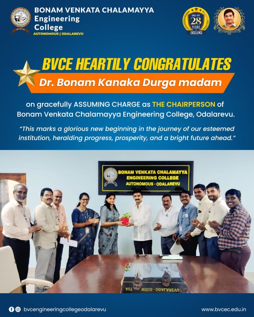 Bonam Venkata Chalamayya Engineering College (Autonomous), Odalarevu, heartily congratulates Dr. Bonam Kanaka Durga on gracefully assuming charge as the Chairperson of our esteemed institution.