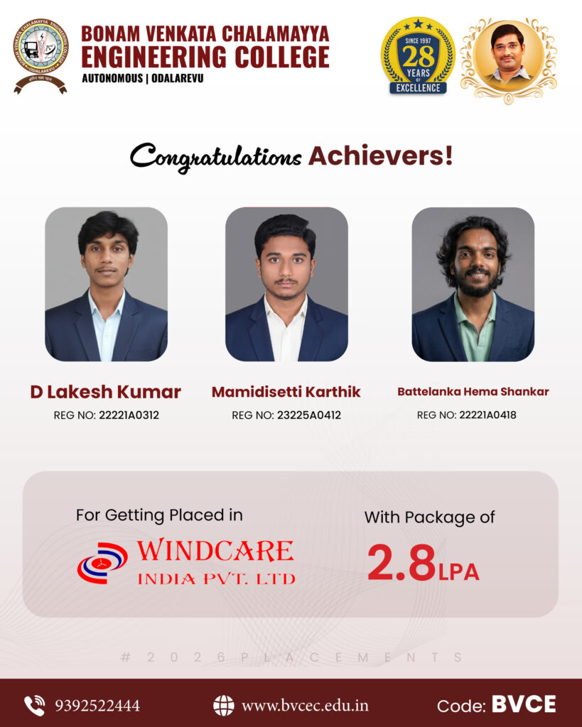 Bonam Venkata Chalamayya Engineering College (Autonomous), Odalarevu, proudly congratulates the following students for their successful placement in Windcare India Pvt. Ltd with a package of 2.8 LPA: