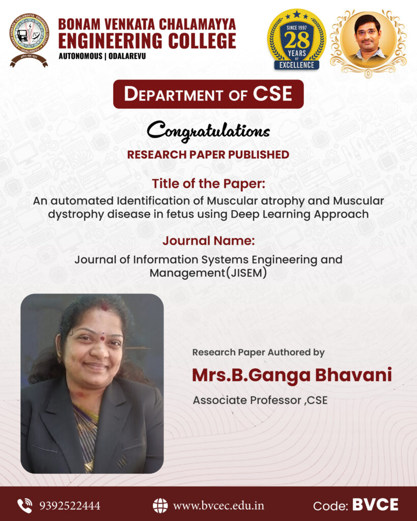 he Department of CSE, Bonam Venkata Chalamayya Engineering College (Autonomous), Odalarevu, proudly announces the publication of her research paper titled: