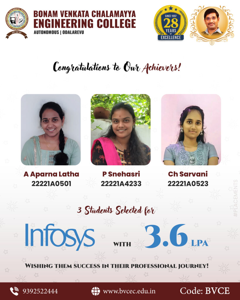 Three BVCEC Students Selected for Infosys with 3.6 LPA!