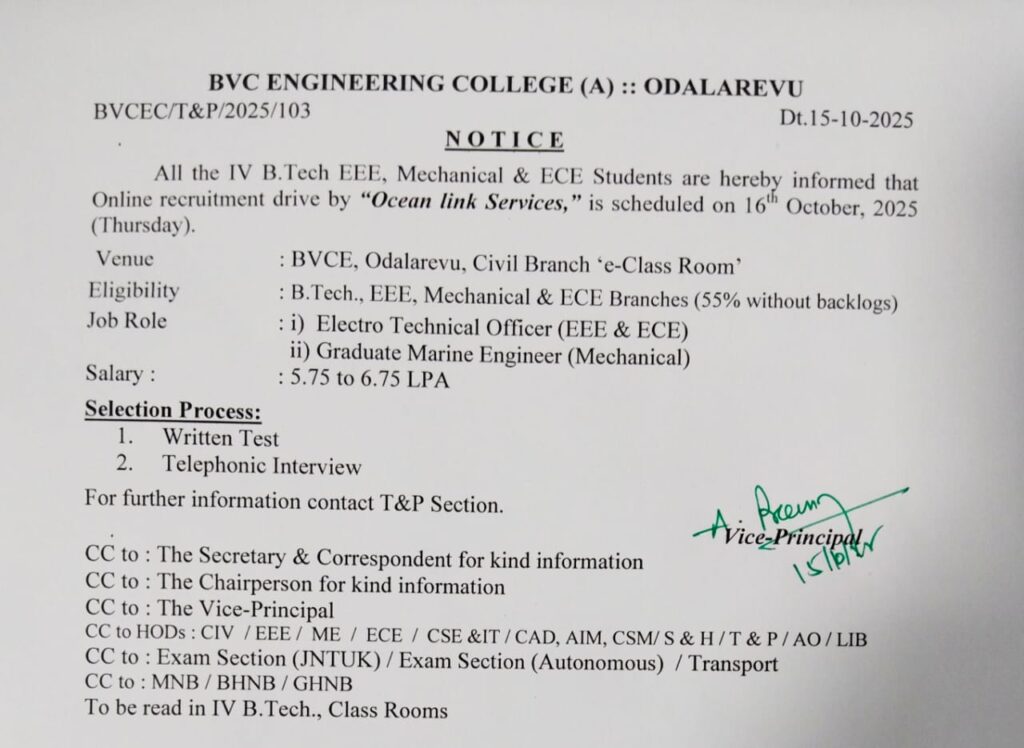 The Training and Placement Cell of BVC Engineering College (A), Odalarevu is pleased to announce that an online recruitment drive by Ocean Link Services is scheduled on 16th October 2025 (Thursday).