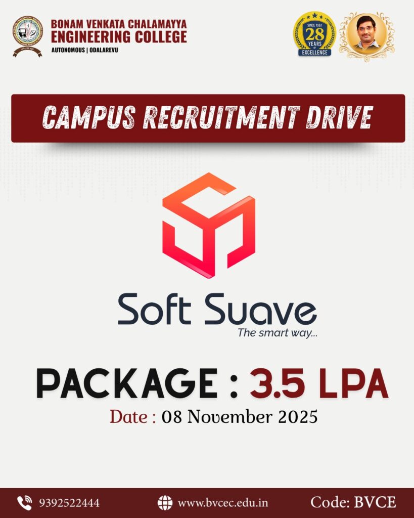 Bonam Venkata Chalamayya Engineering College (Autonomous), Odalarevu, proudly announces a Campus Recruitment Drive by Soft Suave, offering an excellent career opportunity for students with a package of ₹3.5 LPA.