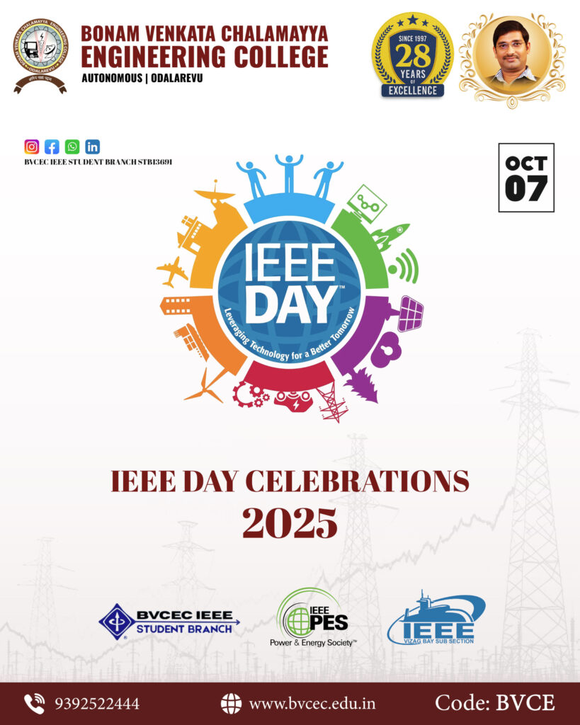Bonam Venkata Chalamayya Engineering College celebrated IEEE Day 2025 with great enthusiasm under the theme “Leveraging Technology for a Better Tomorrow.” The event highlighted the spirit of innovation, collaboration, and technological advancement among students and faculty.