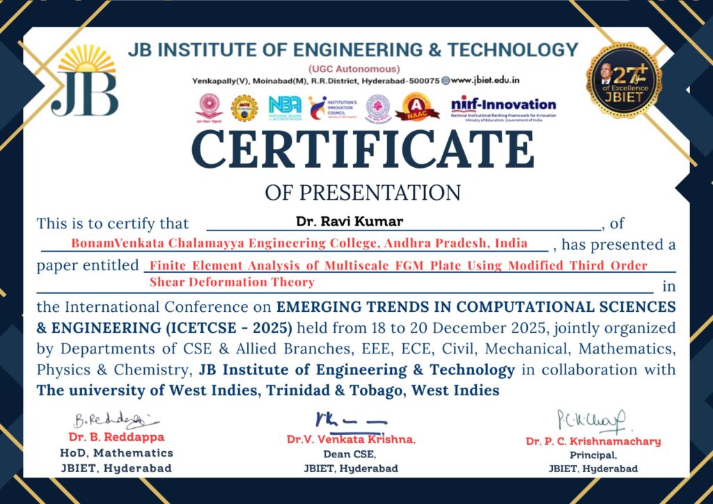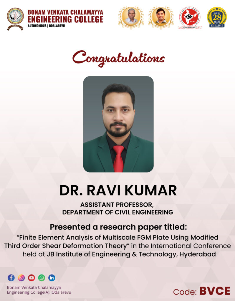 Congratulations Dr. Ravi Kumar | Assistant Professor | Civil Engineering | BVCEC | Research Paper Presented at JB Institute of Engineering & Technology, Hyderabad 🎓