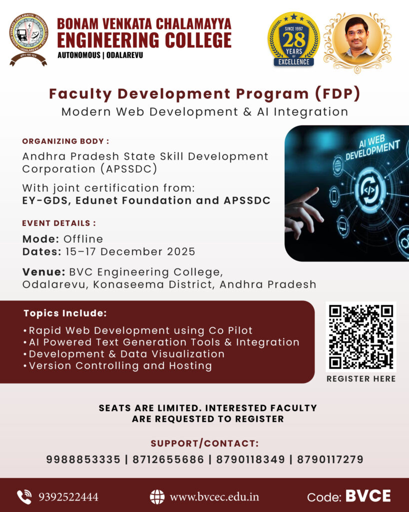 Bonam Venkata Chalamayya Engineering College, Odalarevu, is organizing a Faculty Development Program (FDP) on Modern Web Development & AI Integration.