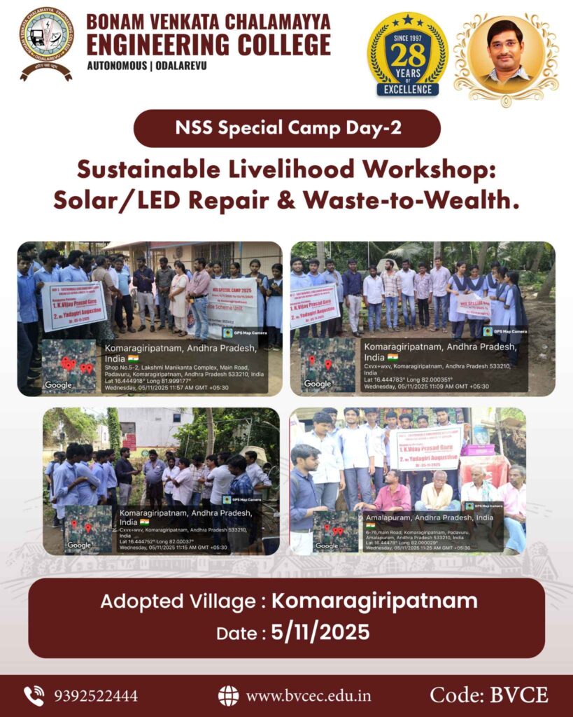 As part of the NSS Special Camp (Day-2), our NSS volunteers from Bonam Venkata Chalamayya Engineering College conducted a Sustainable Livelihood Workshop at the adopted village Komaragiripatnam on 5-11-2025.