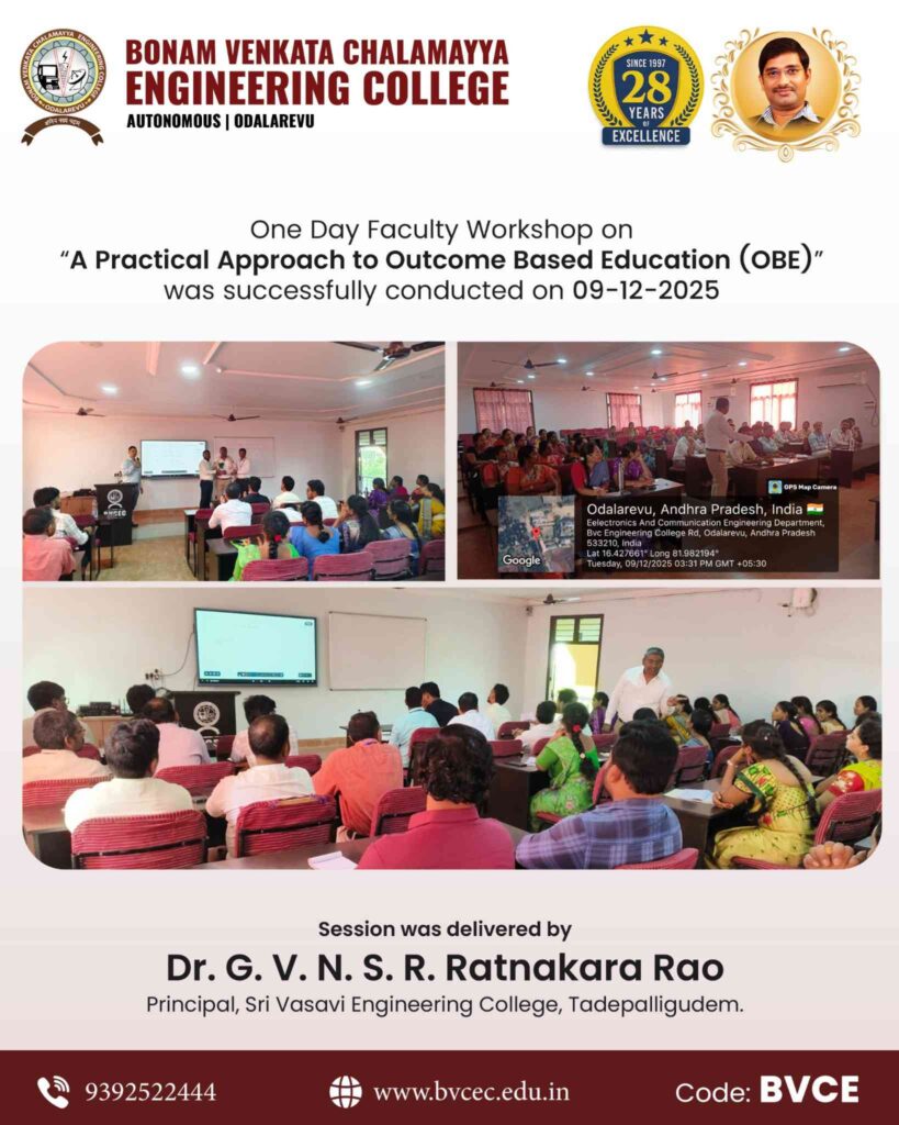 Bonam Venkata Chalamayya Engineering College (Autonomous), Odalarevu, successfully organized a One Day Faculty Workshop on “A Practical Approach to Outcome Based Education (OBE)” on 09-12-2025.