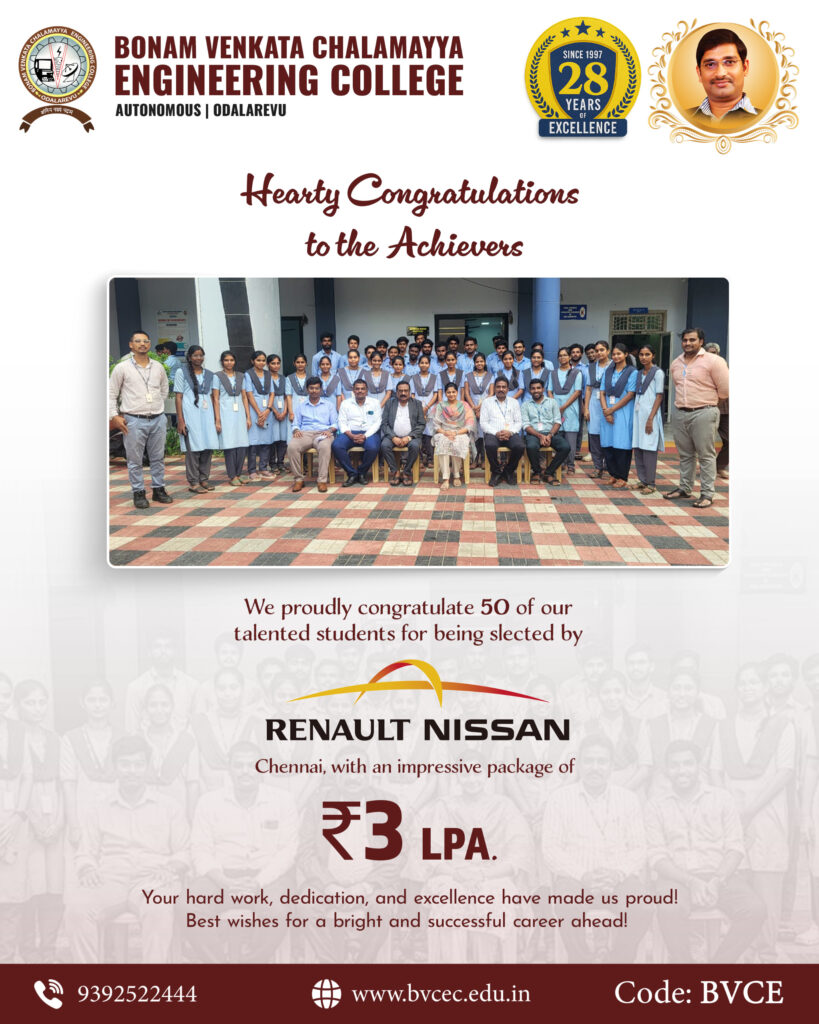 Bonam Venkata Chalamayya Engineering College (Autonomous), Odalarevu, proudly announces that 50 of our talented students have been successfully placed in Renault Nissan, one of India’s leading automobile companies, with an annual package of ₹3 LPA.