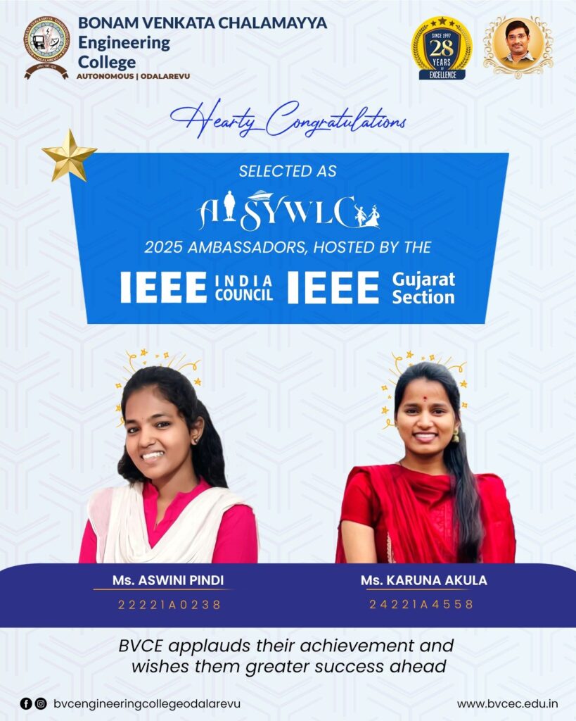 Bonam Venkata Chalamayya Engineering College (Autonomous), Odalarevu, proudly congratulates Ms. Aswini Pindi (22221A0238) and Ms. Karuna Akula (24221A4558) for being selected as Ambassadors for AISYWLC 2025, hosted by the IEEE India Council and IEEE Gujarat Section.