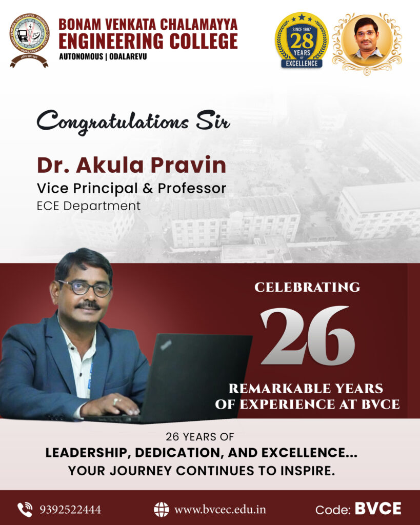 We extend our heartfelt congratulations toDr. Akula Pravin, Vice Principal & Professor, ECE Department,on completing 26 years of exemplary service at BVCEC