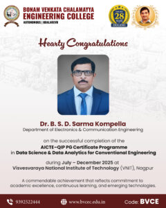 We proudly congratulate Dr. B. S. D. Sarma Kompella on the successful completion of the AICTE–QIP PG Certificate Programme in Data Science & Data Analytics for Conventional Engineering.